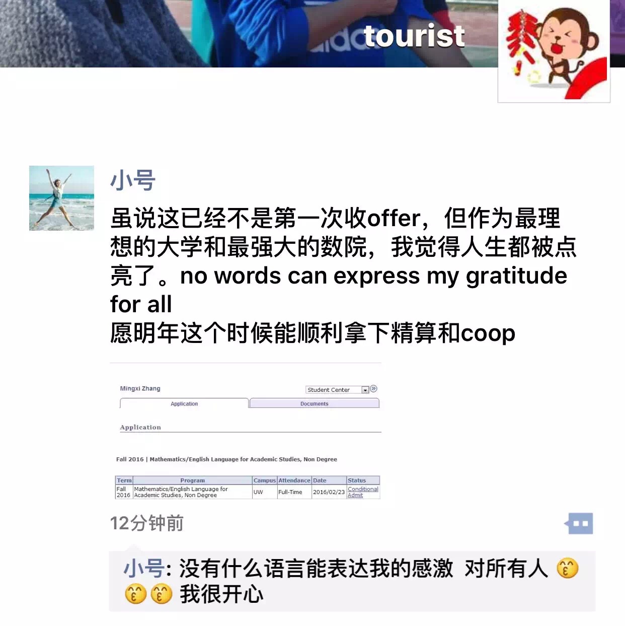 在申請過程中,學(xué)生在滑大的另一個(gè)專業(yè)還被拒錄了,讓我們小小的擔(dān)心了一下,經(jīng)過與學(xué)校溝通,確認(rèn)不會(huì)影響到學(xué)生數(shù)學(xué)系錄取,我們的心才算放下來。 今年2月,就在學(xué)生18歲生日的前一天, 學(xué)生收到了最好的成人禮物-滑鐵盧大學(xué)的Offer 和3000加幣入學(xué)獎(jiǎng)學(xué)金, 終于夢想成真是學(xué)生也是我們最幸福的時(shí)刻!
