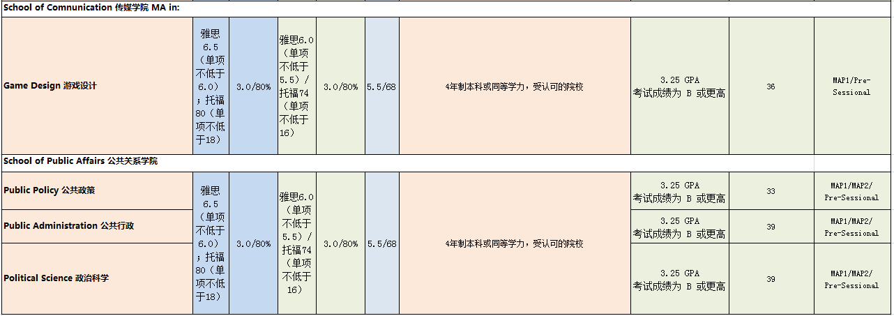 Kogod商學院是華府第一個商學院,位列全美百強,MBA專業為全美前40。國際服務學院是全美最大的國際關系學院,眾多專業位列全美前十。傳媒學院位于全美前25,是美國第三大傳媒學院。公共事務學院位列全美前15名。