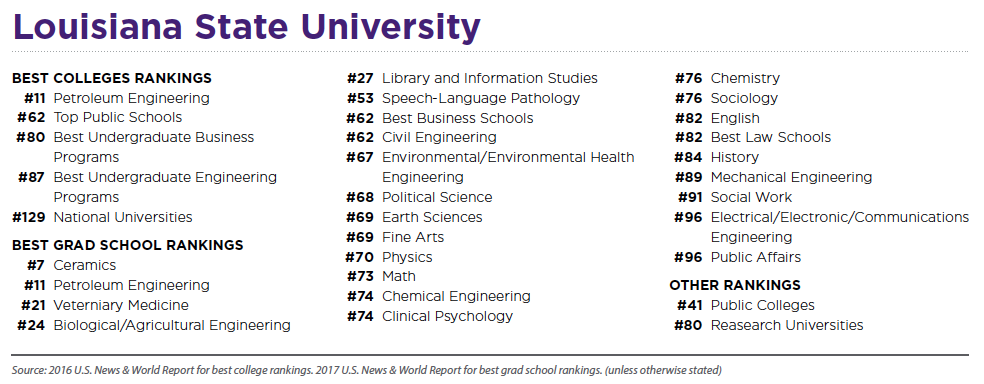 工程學院被譽為全美第五快速發展的工程學院。超過200家企業到LSU工程學院招聘人才。LSU是美國唯一一所使用真實油提供實習培訓的高校。石油工程研究和技術轉化實驗室(PERTT實驗室)是工業規模的石油開采設施,配有用于培訓和研究的全尺寸設備和儀器,該實驗室擁有六口油井。石油工程在《美國新聞與世界報道》排名第11名。