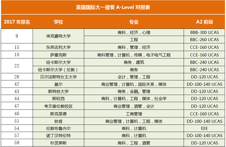 現(xiàn)在,越來越多學(xué)生選擇在國外或國內(nèi)學(xué)A-Level課程,以便擴(kuò)大本科申請學(xué)校,這樣不但可以免去預(yù)科課程,也可以申請牛津、劍橋等頂級(jí)名校。但很多學(xué)生因?yàn)椴涣?xí)慣英國教育體制或語言不達(dá)標(biāo),成績并不理想。現(xiàn)小編整理出“英國國際大一接受A-Level對(duì)照表”,讓各位學(xué)子免去預(yù)科苦惱,照樣直讀大一!