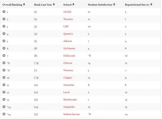 前六名和去年相比沒有變化。在該類別中,多倫多大學學校聲譽排名第一,位于魁省的舍布魯克大學學生滿意度高居第一。