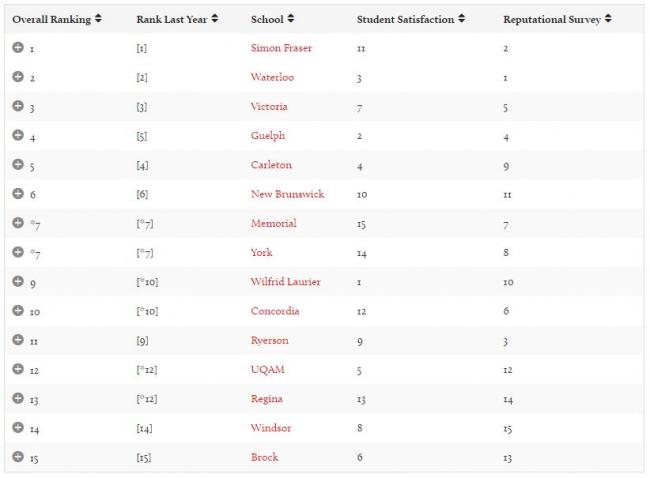 SFU連續三年奪得榜首位置,其在教育計劃及研究的表現獲國際認可地位。排名第9位的威爾弗里德·勞雷爾大學學學生滿意度最高;排名第二的滑鐵盧大學在學校聲譽方面取得頭名。
