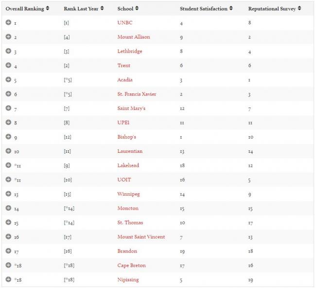 《麥克林》作為加拿大頗具聲望的雜志,其公布的高校排名可信度很高,是加拿大唯一的大學排名榜單。排名包含12項評判條件(學生獎項、學生/教師比例、學系獎項、社會科學及人文類撥款、醫學及科學撥款、著作引用、研究經費、運營經費、圖書館經費、圖書館館藏、助學金、學生服務),各項評分排名后得出綜合排名。與此同時,《麥克林》還以學生滿意度和學校聲望分別進行了排名。在校學生也參與了排名過程,每個學生就大學生活回答了10個問題。