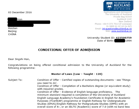 姓名:韓同學學歷:國內211院校大四在讀就讀專業:法律語言成績:雅思(無)平均成績:80分申請院校:新西蘭奧克蘭大學申請專業:Master of Laws(法律碩士)錄取院校:新西蘭奧克蘭大學備注:法律專業向來對于國際生很難申請,對于學生雅思的要求很高,好在學生院校背景不錯,經過一系列的定校和篩選,最終學生如愿拿到奧克蘭大學申的offer,現在正在積極準備雅思,希望能順利升讀,完成學生的名校夢!