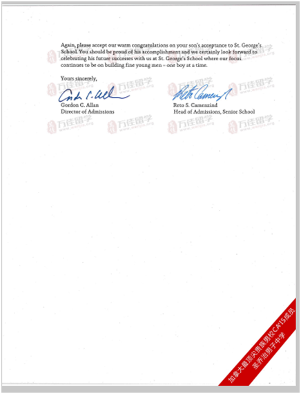 小關(guān)自從參加過英國和美國的夏令營后,就喜歡上了國外的教學(xué)體制和方法,心里一直有一個(gè)出國夢(mèng),但媽媽不放心提早出去,可他是一個(gè)非常有野心的孩子,之前自己在關(guān)注美國的學(xué)校,2月底才得知3.29日加拿大圣喬治頂尖貴族學(xué)校來訪,之前一點(diǎn)兒都不了解,媽媽多方了解到加拿大是相對(duì)比較安全的英語國家,且教學(xué)嚴(yán)謹(jǐn),圣喬治學(xué)校不亞于美國好的私校,于2.29日雙方簽署了留學(xué)合同開始操作。萬佳留學(xué)李紅芬老師和文案同事和媽媽深度溝通后,媽媽也逐漸了解到圣喬治的錄取難度以及我們所面臨的壓力和挑戰(zhàn),尤其是這么短的時(shí)間去應(yīng)付,所以好幾次都會(huì)哽咽“說是自己把孩子給耽誤了”,當(dāng)媽媽的真的不知道怎么做為好,只有真正做了才知道,尤其是頂尖私立貴族學(xué)校。據(jù)圣喬治國際事務(wù)部負(fù)責(zé)人Gordon Allan 先生說,他們從來沒有直接錄取過十年級(jí)的中國學(xué)生,是屬于高一的課程,難度是最高的了,學(xué)校明確講寧愿名額空出來,也一定不會(huì)降低錄取標(biāo)準(zhǔn)。SSAT成績是一方面,學(xué)生需要通過嚴(yán)格的考核,長達(dá)兩個(gè)小時(shí)的筆試以及40分鐘左右的面試以及家長的面試,且小關(guān)面試那天筆試恰巧是安排在晚上,口試是在第二天上午,占了兩天的時(shí)間;怎樣在短短的時(shí)間內(nèi)凸顯你,讓校方認(rèn)同你,不僅語言能力,更重要的要結(jié)合圣喬治要求的六個(gè)核心理念“同理心、謙卑、誠實(shí)正直、尊重他人、勇于承擔(dān)、抗逆能力強(qiáng)”。通過我們和小關(guān)同學(xué)和媽媽的多次溝通,發(fā)現(xiàn)他是一名樂觀、積極、向上、陽光、有愛心、熱愛運(yùn)動(dòng)、生活自理能力強(qiáng)的健康男孩子。他的動(dòng)手能力非常強(qiáng),從小就喜歡拼裝各種模型,如機(jī)器人模型、汽車模型等??釔鄞蚧@球,經(jīng)常參加校內(nèi)外的籃球活動(dòng)。去年暑假還遠(yuǎn)赴美國參加了喬丹飛人訓(xùn)練營,受益頗多。不僅和其它國家的小朋友切磋球技,還在語言交流上有了很大的提高。他還極富領(lǐng)導(dǎo)力和團(tuán)隊(duì)意識(shí),小關(guān)成長了許多對(duì)外界有更多和更深的了解。從思維和邏輯上怎樣游刃有余的與面試官面對(duì)面,珍惜好與面試官的每分每秒,這完全離不開我們文案老師對(duì)小關(guān)同學(xué)的深度培訓(xùn),細(xì)致到“如果給你100加幣的話,你會(huì)怎么花”等等一些前瞻性的問題,引發(fā)學(xué)生多方面思考;包括家長怎么面試,尤其是一直緊張的媽媽,在臨面試前連續(xù)發(fā)燒,為孩子的事情心急如焚,爸爸是醫(yī)生提前安排好病人手術(shù)也無法來到現(xiàn)場,無形中施加了很大的壓力,我們和學(xué)生家長一起又是怎么默契配合的呢?所有的這一切,可能只有經(jīng)歷了才知道,尤其是在我們經(jīng)歷了許多貴族學(xué)校面試的成功案例的一個(gè)強(qiáng)大團(tuán)隊(duì)背后的支持下,經(jīng)得起考驗(yàn)。面試結(jié)束后,小關(guān)媽媽說的最多的話就是“感謝你們,我和孩子盡力了,你們也幫我盡了最大努力了,至于結(jié)果就看老天爺了”。的確是這樣,我們努力了,做到問心無愧,一切順其自然就好。