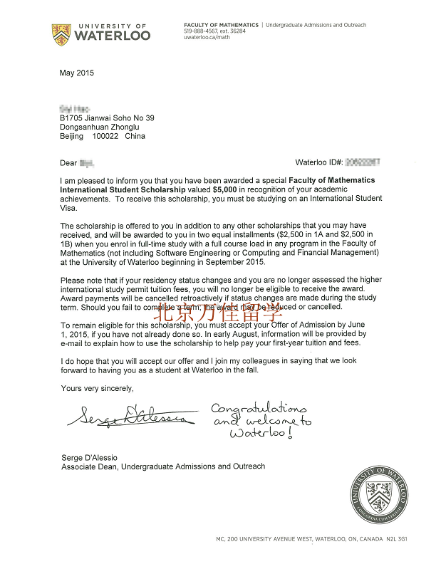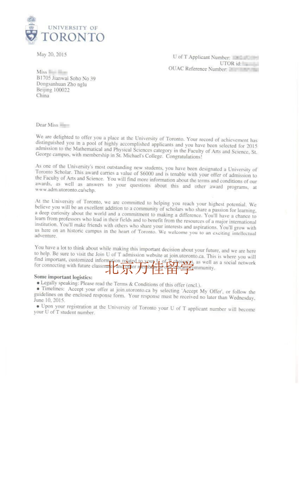 郝同學當時已經高三畢業,雅思最終考到了7分。學生的成績很好,但課外活動并不是特別多。了解到這個情況,李老師還是盡量去挖掘了學生的課外活動及實踐,同時由于學生學習一直特別努力,成績一直很好,李老師跟文書老師詳細的溝通,盡量在文書多多體現郝同學的優勢,每個細節都一絲不茍。在制定選校方案上,郝同學與媽媽開始也非常迷茫,經過與李老師幾次的溝通,結合郝同學和經過一年時間,最終學生申請了三所學校——多倫多大學、滑鐵盧大學帶薪實習,西安大略大學均全部拿到了offer,并且拿到了多倫多大學6000加幣獎學金,滑鐵盧大學5000加幣!!郝同學一家因此非常高興,十分感謝加拿大部李丹丹老師和文案老師的辛勤付出!經過與李老師反復的商討,最終郝同學選擇了獎學金最多,世界排名最好,最著名,也是正常4年本科的多倫多大學!