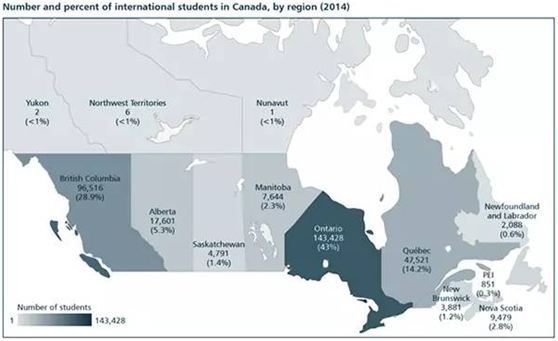 越來越多的人選擇了加拿大留學,大家都去了加拿大的什么地方呢?請看以下數據: