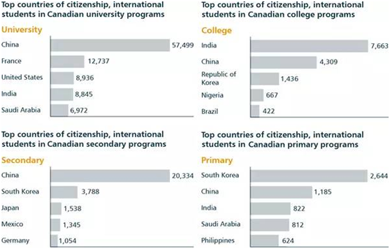 加拿大留學生中,就讀大學和學院的學生最多,中國學生去加拿大讀本科的人數最多,高達57,499人,但是申請學院、中學就讀的也不在少數。在目前留學低齡化的年代,相信未來會有更多的人選擇中學甚至小學去到加拿大學習。