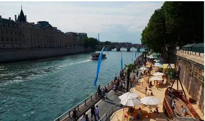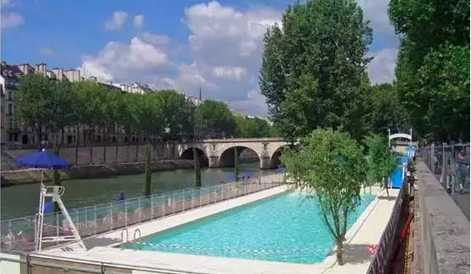 巴黎塞納河是不允許游泳的,這個可以理解,所以愛變通的巴黎人覺得海灘都能自己造,一個泳池算神馬。