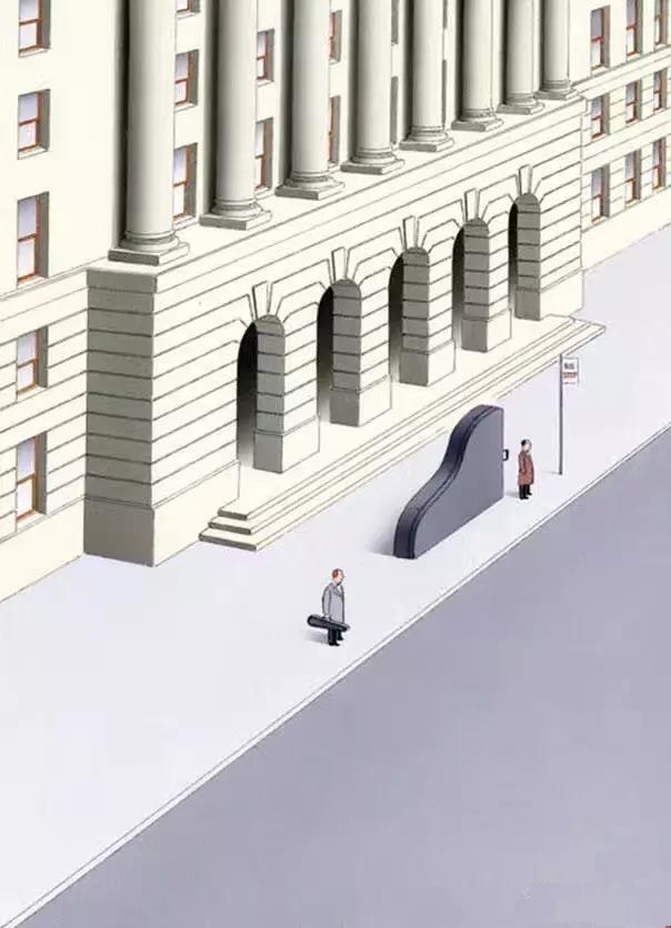 Guy Billout,法國藝術家、插畫師,出生于1941年,曾在廣告業工作一段時間,1969年移居紐約并開始為一些雜志社工作,客戶包括《紐約時報》、《紐約客》等,畫面風格干凈簡潔,常融合一些諷刺元素, 藝術家官方網站:http://www.guybillout.com/。