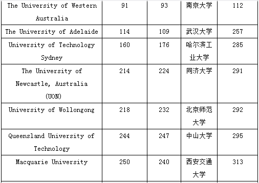 從綜合排名中可以看出,澳大利亞共有五所高校殺進世界前50,澳大利亞國立大學排名第24,較去年略有下降,墨爾本大學排名第39,悉尼大學42,都較去年略有上升,新南威爾士大學排名第45,與去年持平,昆士蘭大學、蒙納士大學和西澳大學都有上升,阿德萊德大學較去年略有下降,要加油喲!