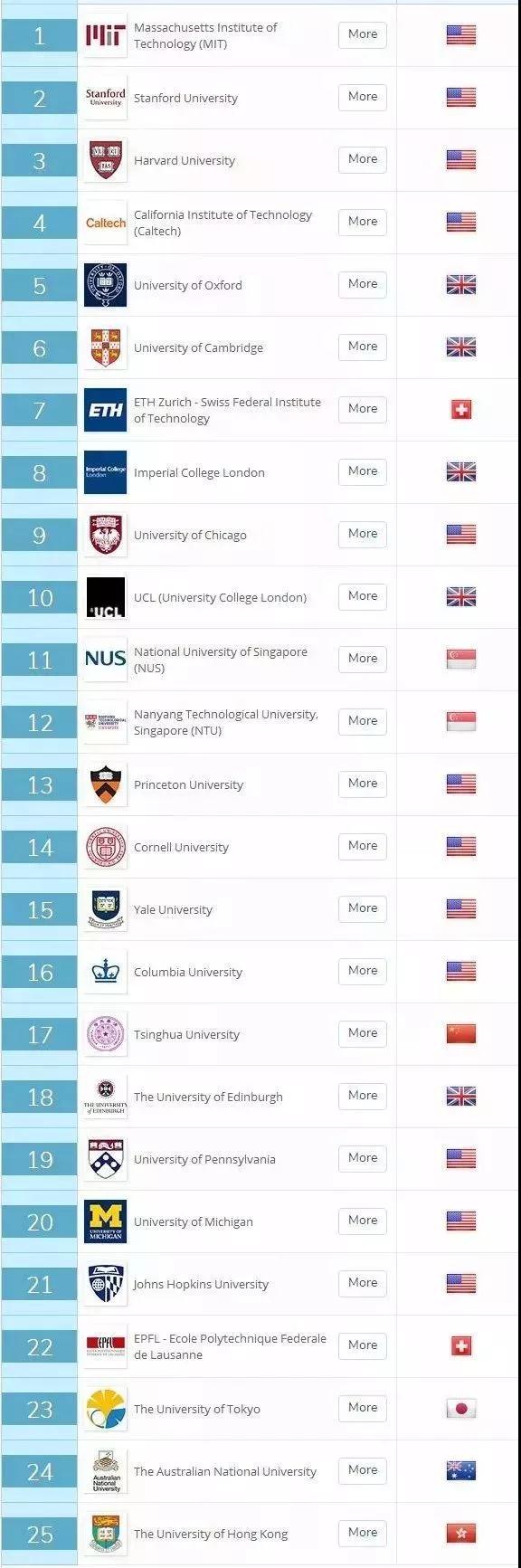 美國(guó)共有157所大學(xué)入圍,有19所大學(xué)入圍世界前50位,依然彰顯了世界教育的強(qiáng)勢(shì)地位。