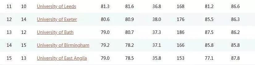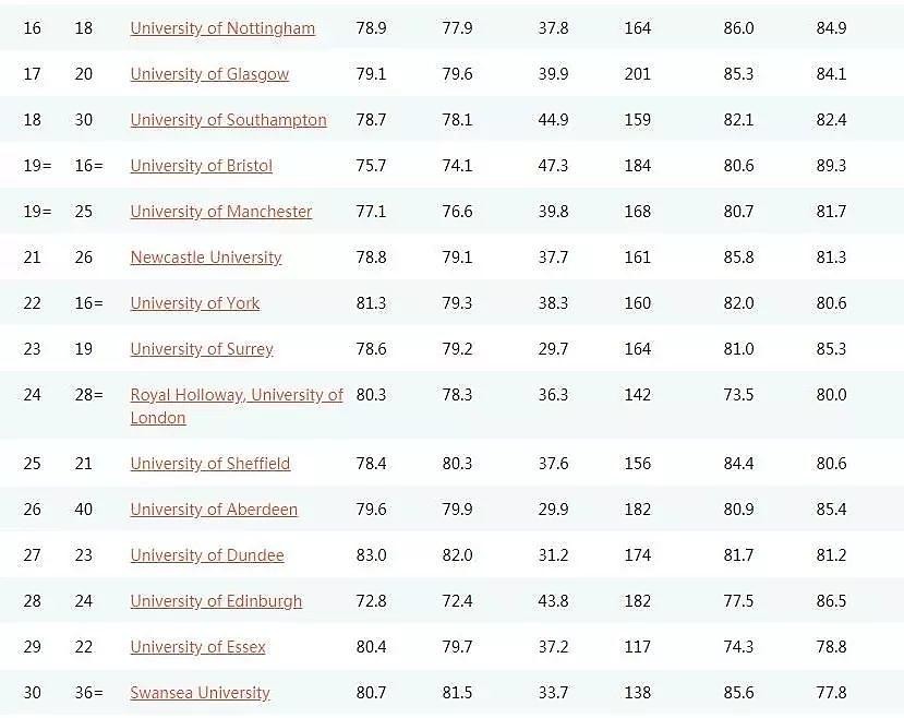 10-20名與去年相比變動不大,各個大學幾乎在小區間內微微浮動。變動明顯的是南安和曼大。南安今年名次上漲12位,超過了曼大,終于回歸前20。綜合實力不容小覷。曼大實至名歸的進入了前20。原本位列40,在醫學界享有盛譽的阿伯丁升至26,有工程師搖籃之稱的斯旺西喜提前30。有喜就有悲,約克和薩里意料之外的跌出前20。