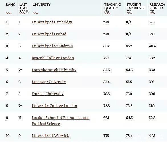 去年十強與今年十強對比劍橋,牛津,圣安和帝國理工的前四位置屹立不倒。杜倫大學如今跌出前5,而拉夫堡大學乘著去年的東風,一舉拿下第五的獎杯。蘭卡斯特大學穩贏第6,而倫敦政經將利茲擠下前十的寶座。
