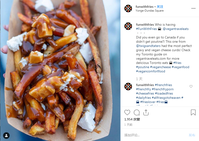 “Poutine是地球上最好吃的垃圾食品。”這個形容我覺得完全是恰如其分,高熱量的薯條、肉汁和奶酪制成的食品,卻能讓眾多并不想長胖的人們趨之若鶩,看到poutine就會忘記節食然后大快朵頤。如果你沒有去過加拿大魁北克,很難想象poutine在當地有多么流行。這個起源于上世紀50年代加拿大魁北克省鄉村地區的小吃在之后的幾十年迅速席卷魁北克省的大街小巷,并傳遍整個加拿大。時至今日,在魁北克省主要城市如蒙特利爾、魁北克城的街邊小店、夜店pub、路邊攤兒甚至在麥當勞和肯德基(肯德基在魁北克省叫“PFK”)中你都可以找到poutine的身影,在加拿大的其他城市甚至美國北部地區你也可以輕松地找到一家菜單上有poutine的餐廳。