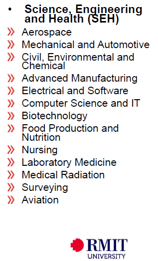 該獎學金面向攻讀RMIT皇家墨爾本理工大學科學、工程與健康學院的中國學生,該獎學金可用于減免學費。該學院主要為學生提供以下各專業的課程:
