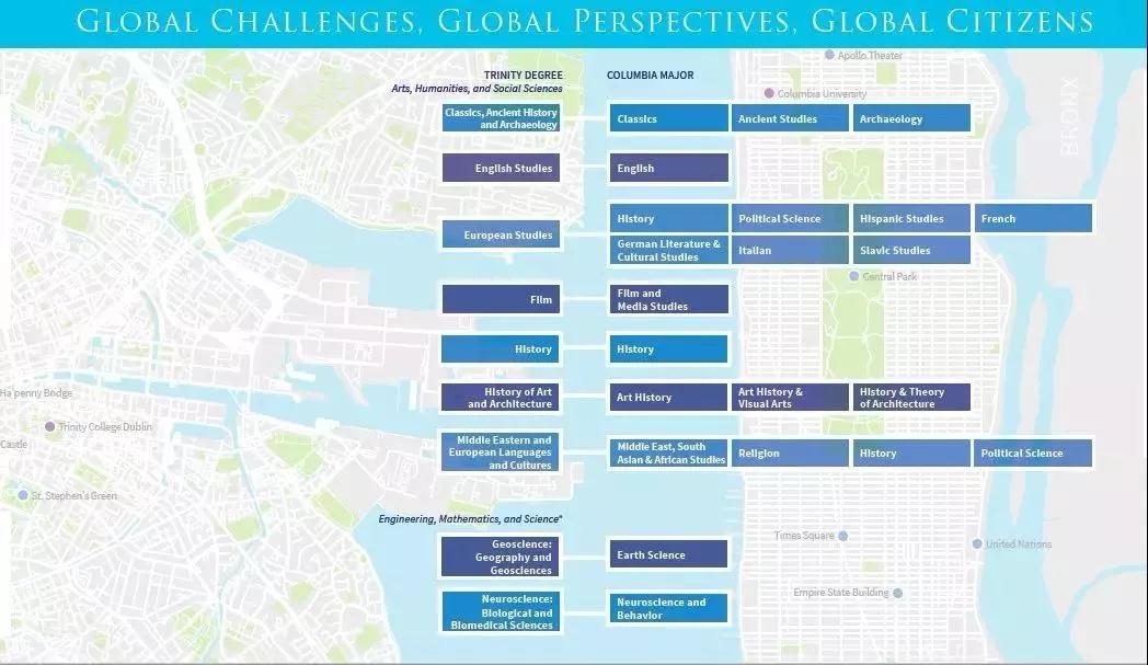 圣三一與哥大的雙學位課程賦予學生在兩所世界頂尖大學學習的機會。橫跨兩大洲和兩個國際大都會城市:前兩年在世界名校都柏林圣三一大學學習,后兩年在美國常青藤盟校之一的紐約哥倫比亞大學就讀。僅4年時間,學生畢業后可分別獲得這兩所大學的本科學士學位。