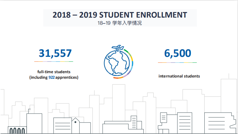 01、2018-2019學年共有 31,557 名全日制學生(含約 6,500 名國際留學生)和 65,828 名業余制學生。,較2017-2018年全日制注冊學生數額有顯著的增長,國際生的比例保持穩定,繼續為學生提供高質量的教學環境。