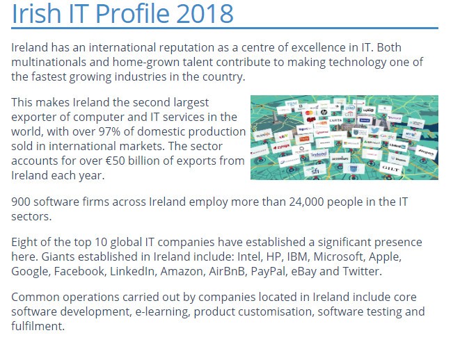 根據Irish IT Profile 2018中的數據,2016年,愛爾蘭共有81595名信息通信技術專業從業人員,其中專門工作于通信技術部門的有55,866人(占總數的68%)。 報道中還指出,愛爾蘭的900家軟件公司在IT行業雇傭了超過24000人,這些位于愛爾蘭的公司開展的常見業務包括核心軟件開發、電子學習、產品定制、軟件測試和實現等。
