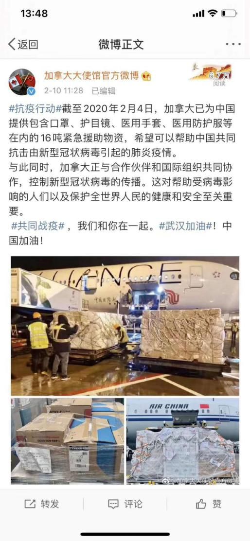 自從疫情發生以來,加拿大政府一直對中國伸出援手,除了捐贈物資外,加拿大教育界都廣泛積極支持中國防控新冠肺炎疫情。近日,加拿大多所著名大學,包括阿爾伯塔大學、薩斯喀徹溫大學、里賈納大學、渥太華大學、西安大略大學、紐芬蘭紀念大學、蒙特利爾大學、康考迪亞大學等,紛紛表態支持中國抗擊疫情。截止2月4日,加拿大已為中國提供包含口罩、護目鏡、醫用手套、醫用防護服等在內的16噸緊急援助物資。
