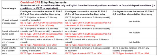 舉例說明:如果學生是想用普通A類雅思+UKVI雅思來申請語言課,需提供UKVI 總分4.0(各單項不低于4.0+)+普通A類雅思5.5(單項不低于5)則符合申請10周語言的要求,以此類推。