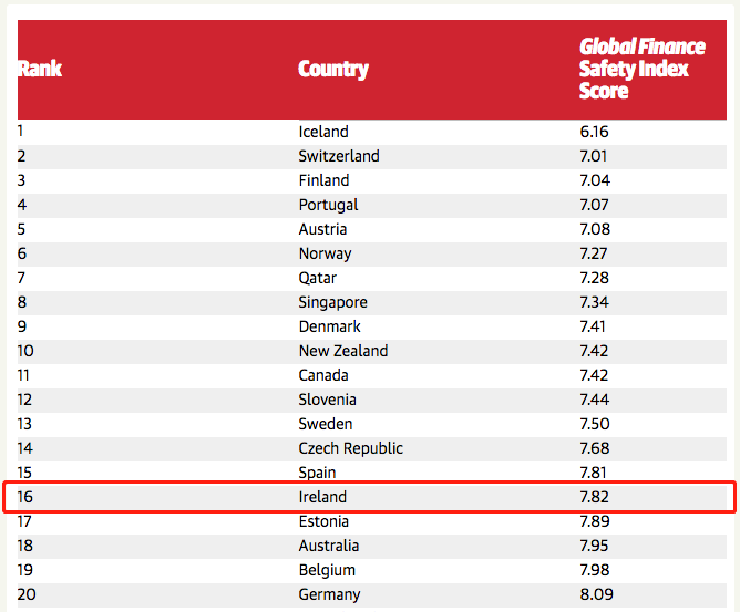 作為全球七大中立國之一,愛爾蘭政局向來十分穩定。在“2019全球最安全國家”排名中,愛爾蘭位居十六,是歐洲犯罪率最低的國家之一。