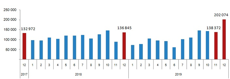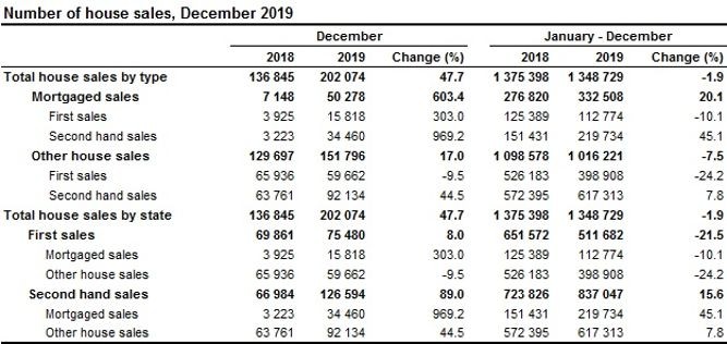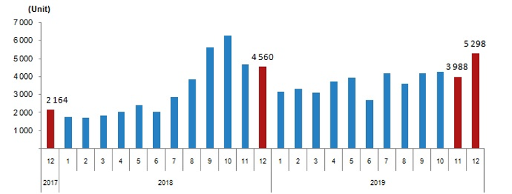 其中2019年12月,房屋銷售量同比增長47.7%,達到約202,000套,其中新房75,480套,二手房近126,600套。外國人購買了約5,300套房屋,同比增長16.2%。