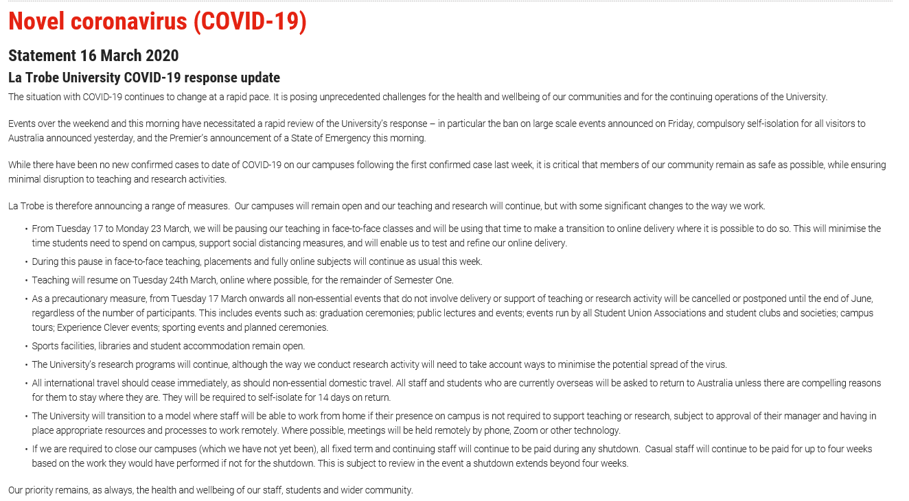 3月17日至23日將暫停面授課程,并將利用這段時間過渡到在線授課。教學將于3月24日以上網課形式恢復。從3月17日起,所有非必要活動將被取消或推遲到6月底,無論參與者的人數。體育設施、圖書館和學生宿舍保持開放,大學研究項目將繼續進行。詳情請查看官網:https://www.latrobe.edu.au/about/novel-coronavirus
