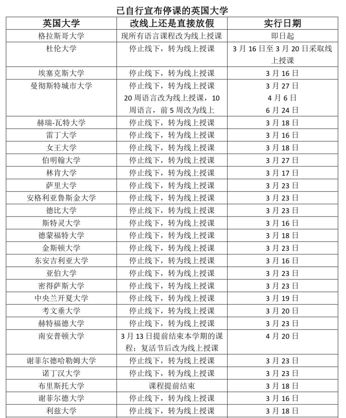 雖然鮑里斯在講話中沒有明確表態關閉學校,但英國高校是有權力自主決定是否停課或者改上網課的。目前,大部分英國大學已經開始有所行動,以下列表中為英國部分院校信息匯總,如果大家所就讀的院校不在此列表中,大家也可以直接查詢學校官網,獲得最新信息。