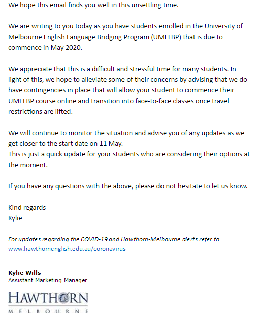 Hawthorn發(fā)郵件通知說(shuō)由于疫情和禁令的影響,入讀5月11日語(yǔ)言課的學(xué)生,暫定開設(shè)網(wǎng)課,等待禁令解除后,然后進(jìn)行教室授課,等待開學(xué)時(shí)間快到了的時(shí)候,學(xué)校會(huì)進(jìn)一步更新信息,提醒學(xué)生,留意自己的郵箱,因?yàn)殛P(guān)于網(wǎng)課的詳細(xì)通知,學(xué)校一般會(huì)直接發(fā)給學(xué)生本人,也請(qǐng)學(xué)生這段時(shí)間考慮下是否接受網(wǎng)課。