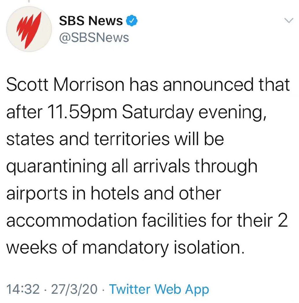 今天下午,澳大利亞總理斯科特·莫里森(Scott Morrison)宣布,從明晚3月28日晚上11:59開始,所有返回澳大利亞的旅客必須在旅館接受集中隔離14天結(jié)束后,才能返回家中,澳大利亞聯(lián)邦軍隊(duì)將協(xié)助各州、領(lǐng)地警方進(jìn)行強(qiáng)制隔離,以此來(lái)應(yīng)對(duì)疫情擴(kuò)散。