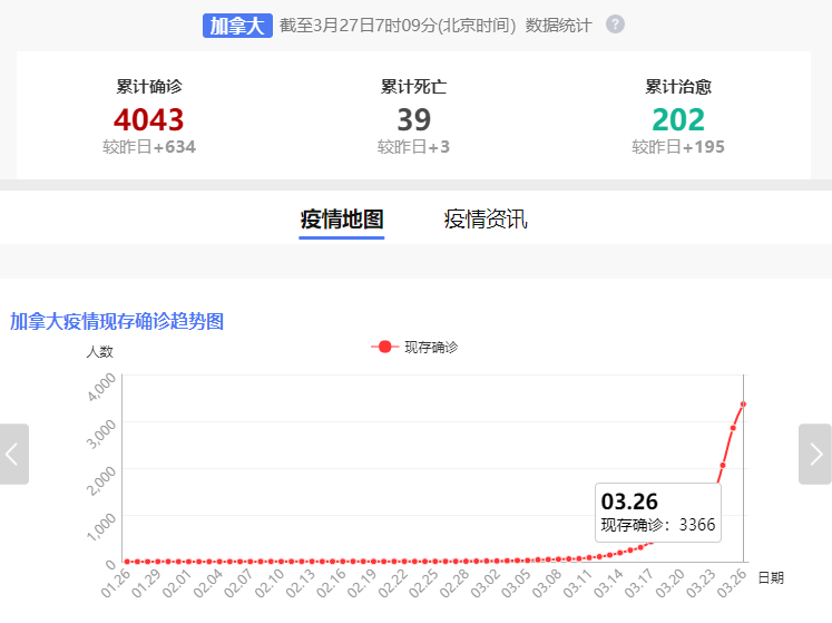 目前,加拿大新冠肺炎確診人數(shù)繼續(xù)大幅增長(zhǎng),最新消息顯示,目前累計(jì)確診人數(shù)已達(dá)4043例,確診人數(shù)較昨天新增634例。以下是截止目前,加拿大最新疫情最新數(shù)據(jù):