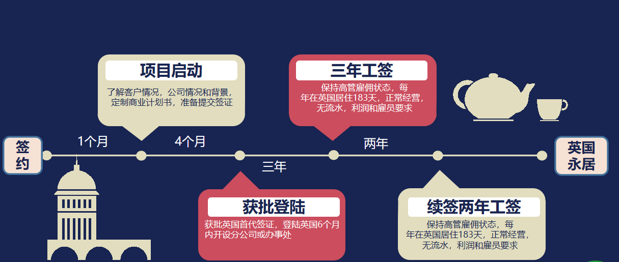 英國境外公司,可派遣一名高級管理人員前往英國,設立代表處或全資子公司。此高管將成為英國分支機構的首席代表,獲得三年工作簽證,配偶及18歲以下子女可一同前往英國,子女享受英國教育,全家享受英國居民的福利和待遇。在三年工簽到期后可續簽兩年簽證,一共五年后,滿足一年不少于183天的居住要求后,可以申請英國永居。
