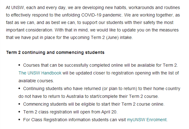 根據目前疫情情況, 新南威爾士大學Term2開學的課程,可以選擇線上學習, 注冊開放時間為4月20日。