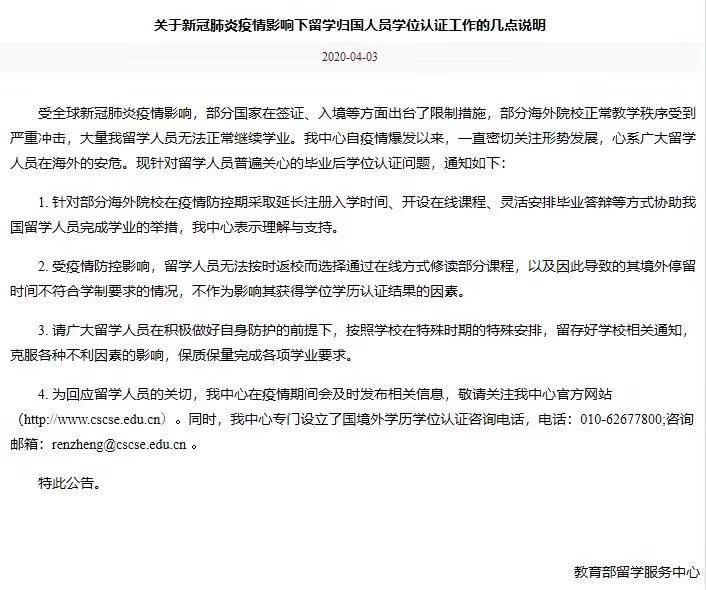 “疫情下提前回國了,學位認證怎么辦?”這個問題終于在今天得到了教育部留學服務中心官方的答案:受疫情防控影響,留學人員無法按時返校而選擇通過在線方式修讀部分課程,以及因此導致的其境外停留時間不符合學制要求的情況,不作為影響其獲得學位學歷認證結果的因素。