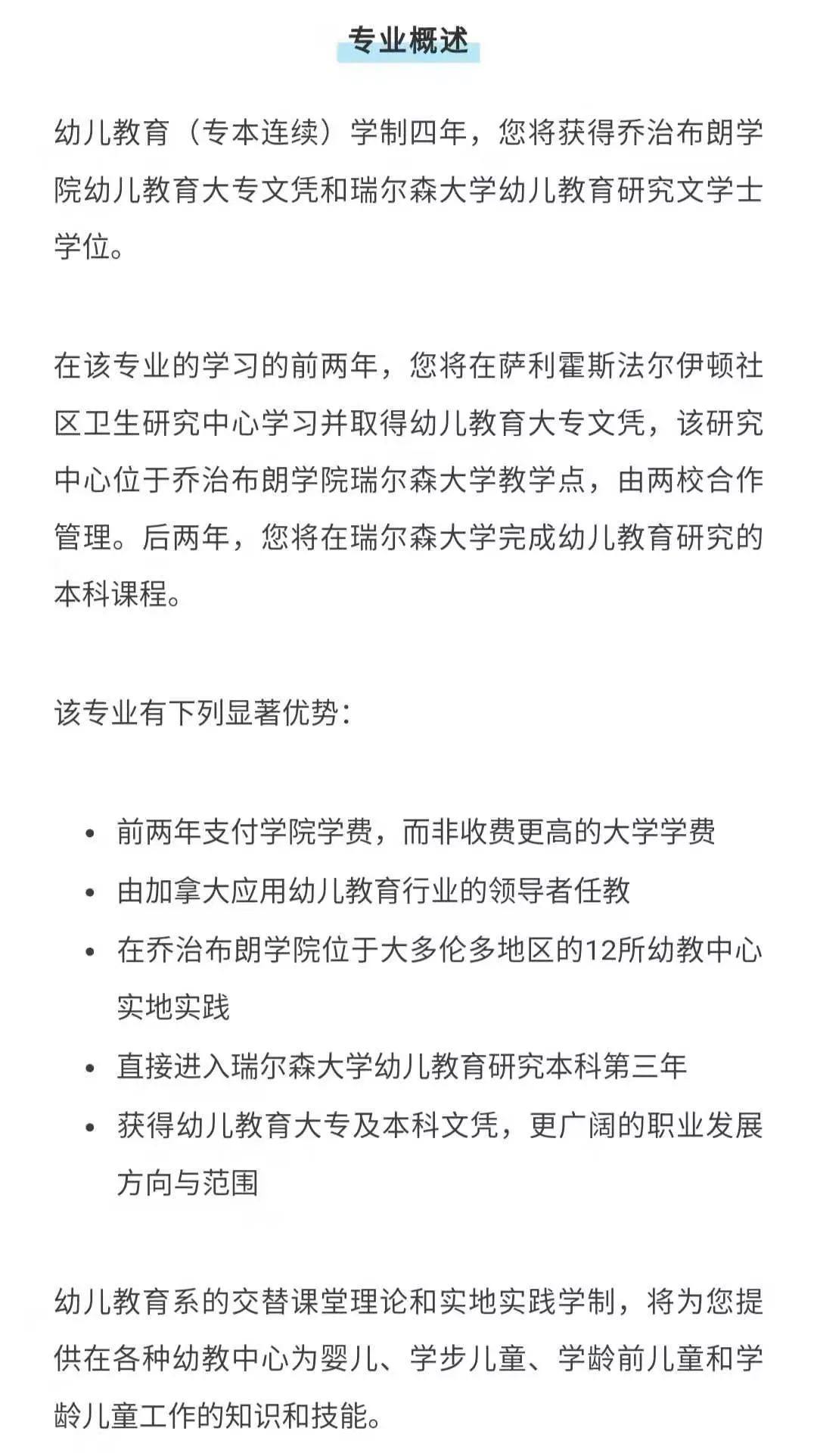 喬治布朗學(xué)院開設(shè)有跟瑞爾森大學(xué)專本連讀的幼兒教育專業(yè),畢業(yè)后學(xué)生可以獲得喬治布朗學(xué)院的幼兒教育大專文憑和瑞爾森大學(xué)的學(xué)士學(xué)位證書。