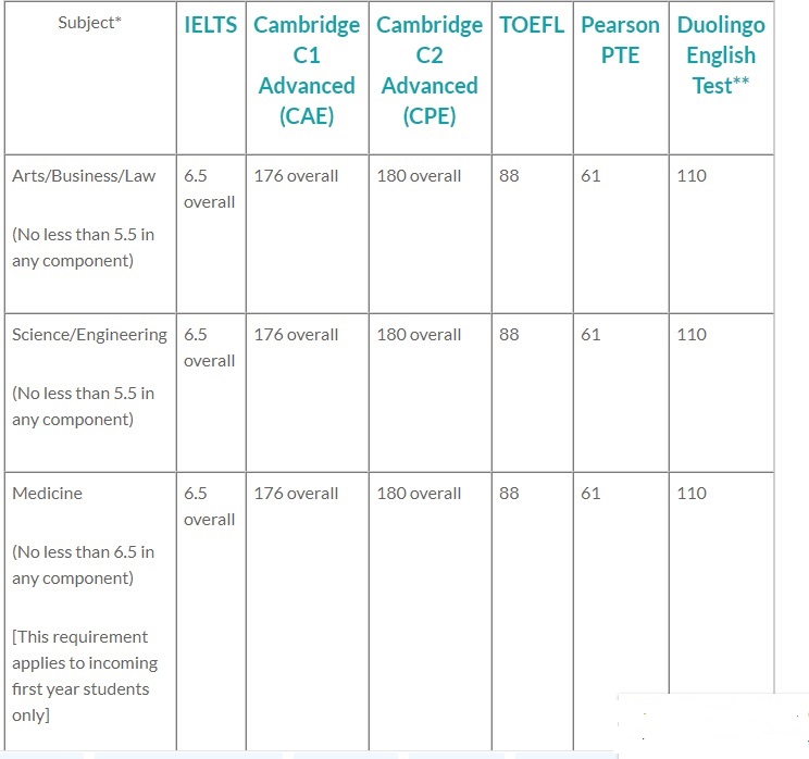 ● DET 110分 等同于 IELTS 6.5, 單項不低于6。適用于所有本科,碩士的 工程與計算機學院 和 科學與健康學院, 商學院下面的金融學和國際會計與商業碩士。