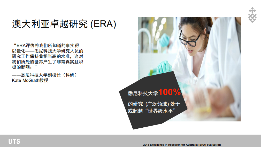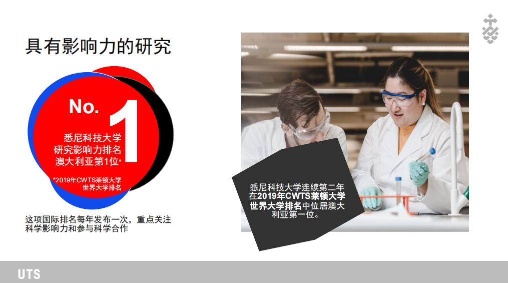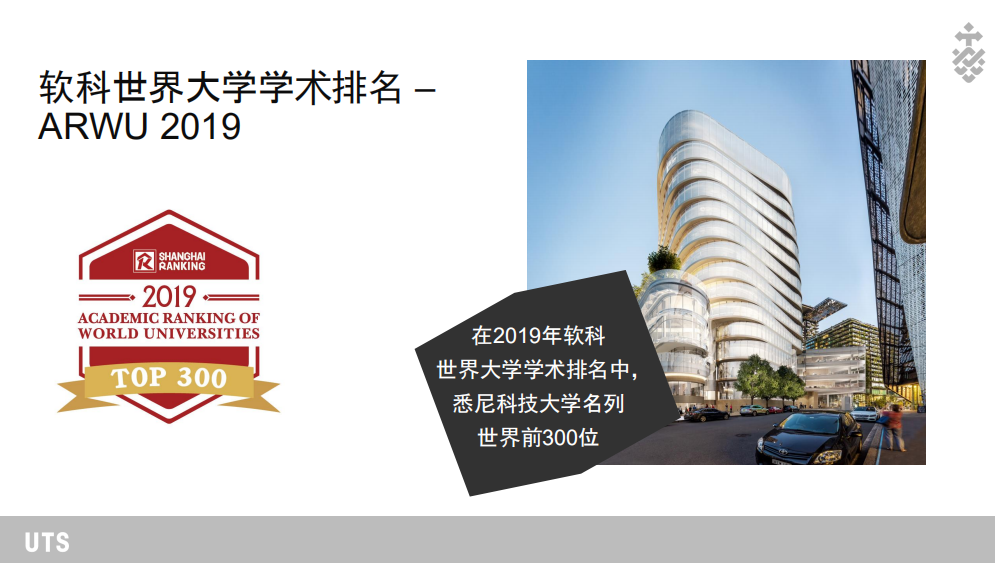 悉尼科技大學(University of Technology Sydney,簡稱UTS)2020年QS世界大學排名,UTS位居全球第140位。UTS是全球排名第11位的新興大學,澳大利亞排名第1位。在另一份2020年泰晤士高等教育(TIMES)的榜單上,UTS的表現同樣出色,綜合排名位列全球第194位。在學科排名上,UTS的多個專業位列2019年軟科世界一流學科榜單(ARWU)全球前50位:護理學(8)、計算機科學和工程(29)、通信工程、旅游休閑管理、遙感技術。