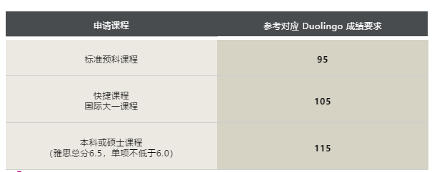 Duolingo English Test的最高分是160分,麥考瑞大學(xué)接受以下成績,并對未達(dá)到標(biāo)準(zhǔn)的申請者配套語言教學(xué)。