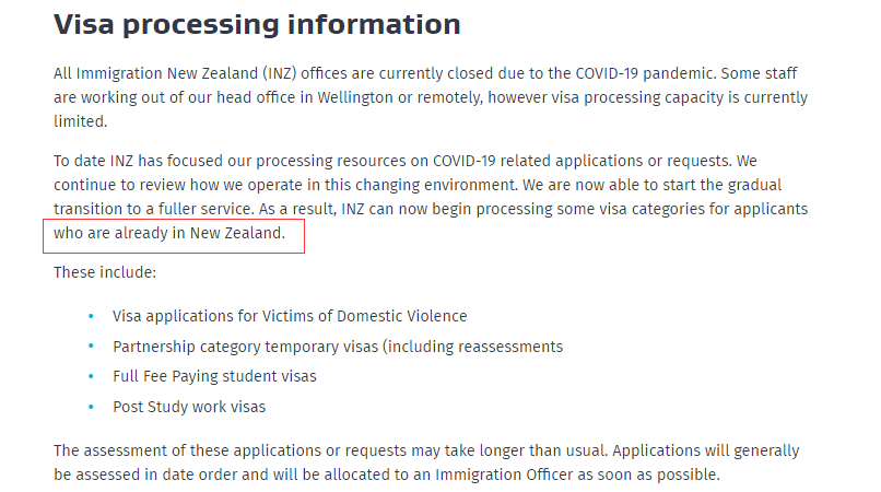 受疫情影響,新西蘭移民局INZ海外辦公室一直處于關閉狀態。2月份起移民局北京辦公室開始關閉,所以疫情期間從國內遞交的學生簽證申請目前都是處于pending狀態,雖然移民局也在想辦法分流一些北京辦公室的申請,但是目前來看收效甚微。目前新西蘭移民局官網更新針對已經在新西蘭的申請人部分簽證已經開始逐漸審理了。