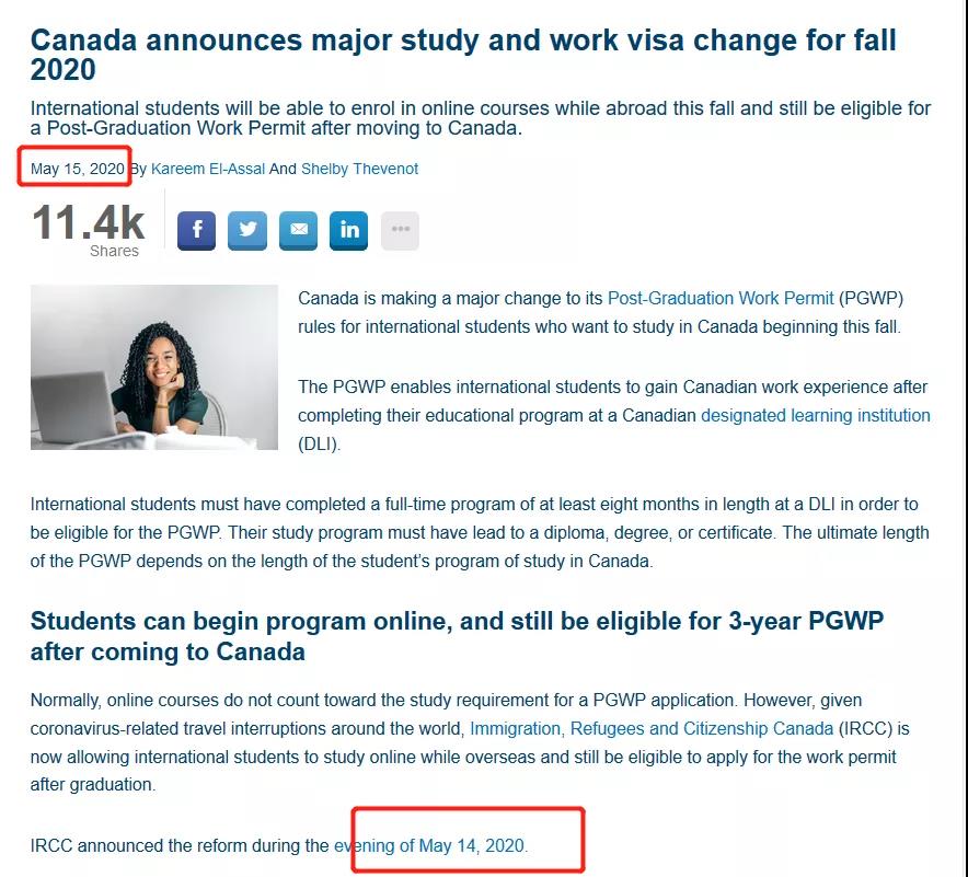 早在4月初,加拿大移民局IRCC首次對5月和6月開學的國際學生公布了這一政策,2020年秋季加拿大各大院校的招生都在正常進行中,這一公告告知我們新的留學生們可以在海外上網課,網課課程達到50%也可以申請PGWP項目。相比以往的網課不能超過20%的政策,這個變化可以說是巨大的。