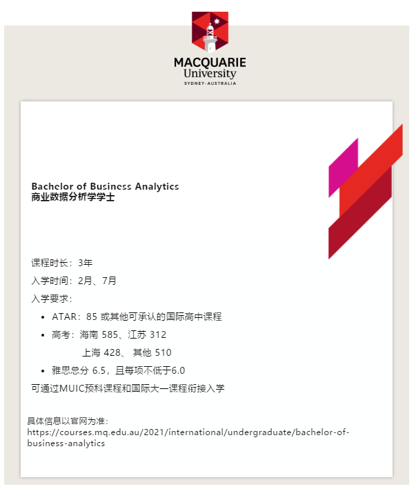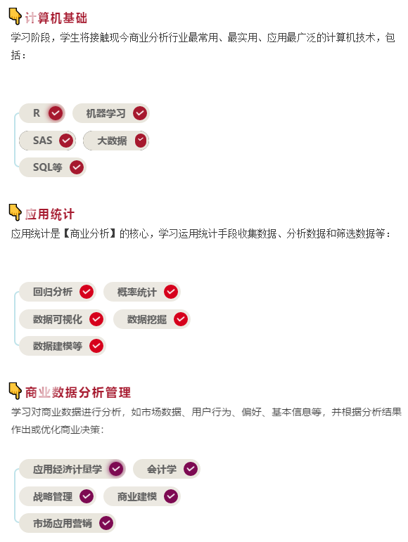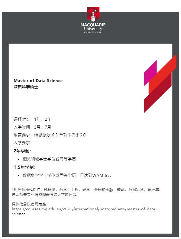 由于【商業分析】專業的特殊性,麥考瑞大學碩士階段課程結合計算機技術+應用統計+商業數據分析管理,科學的為學生提供高質量的學習體驗。