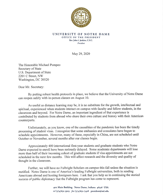 5月29日星期五,圣母大學校長詹靜思(Rev. John I. Jenkins, C.S.C.)致函美國國務卿邁克爾·蓬佩奧,敦促美國國務院優先考慮加快國際學生的簽證,以便他們可以在秋天返校上課。