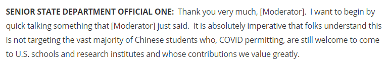 禁令將于美國東部時間6月1日凌晨生效。但是,美國方面于6月1日給出了相應的解釋,發布會上,相關人員解釋了禁令可能會涉及到的學生群體,表示“涉及到的僅是很小比例的學生”,“并不是針對絕大多數中國學生,在防疫條件允許的情況下,仍然歡迎他們來到美國的學校和研究機構”。