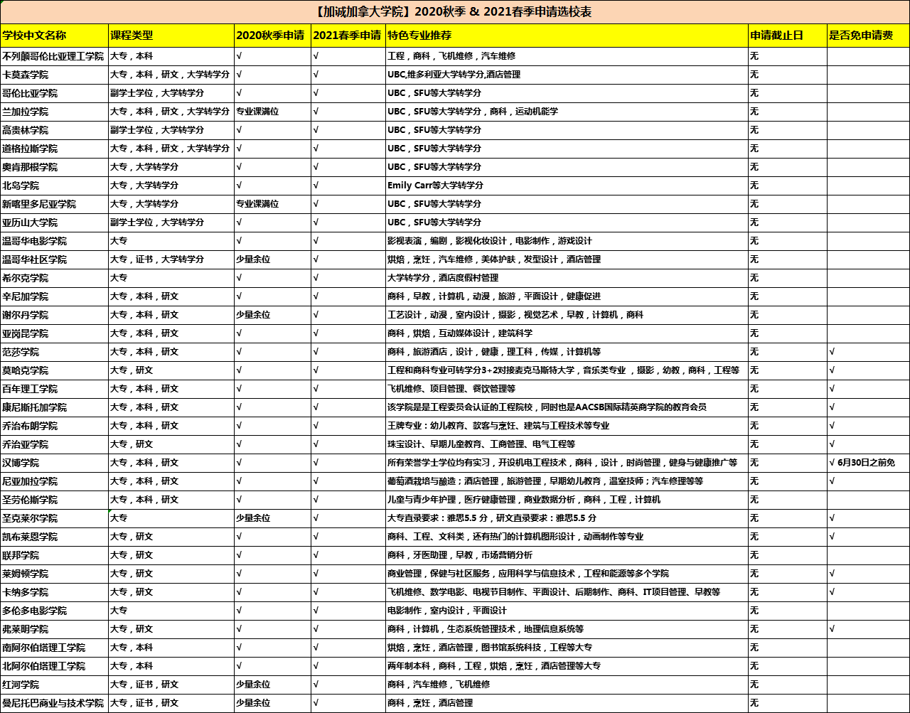 下面是加拿大學院2020秋季&2021春季選課總表,請各位參考: