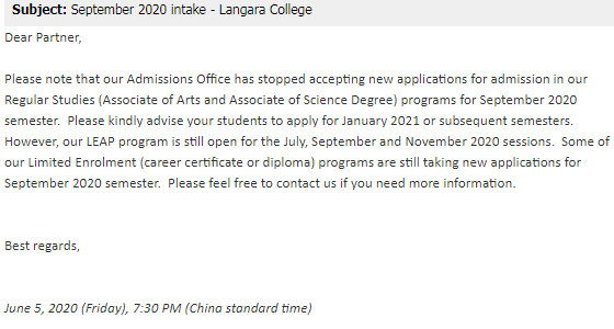 學校已經停止接受2020年9月入學的regular studies (Associate of Arts and Associate of Science Degree) 新申請。請通知學生申請2021年1月入學的課程,或者更晚一點的課程。不過,學校的LEAP 課程2020年7月,9月和11月都是開放的。一些 Limited Enrolment (career certificate or diploma) programs 仍在接受2020年9月學期的新申請。