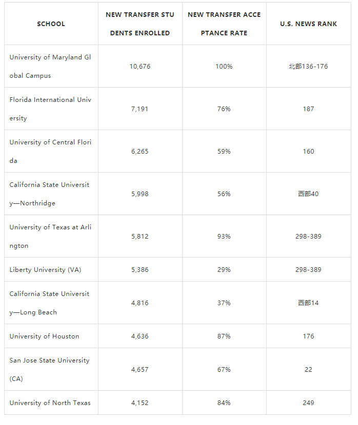 U.S. News 統(tǒng)計(jì)了 1138 所大學(xué)在 2019年的轉(zhuǎn)學(xué)生數(shù)據(jù),發(fā)現(xiàn)數(shù)據(jù)差異很大,有 10 所接受轉(zhuǎn)學(xué)學(xué)生數(shù)量最多,新轉(zhuǎn)學(xué)學(xué)生的平均錄取率為64%,幾乎全是公立大學(xué),只有一個(gè)Liberty University是私立的。