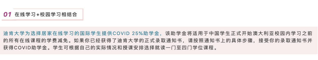迪肯大學表示,選擇居家在線學習的國際學生將獲得 25%助學金,該助學金將適用于中國學生正式開始澳大利亞校園內學習之前的所有在線課程的學費減免!