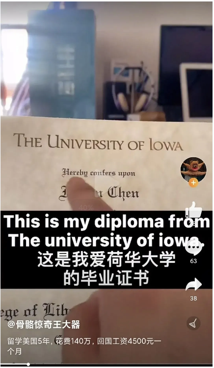 據視頻中的該小伙自己介紹,他畢業于美國愛荷華大學,在美國排名70多,相當于美國一所普通中等的大學。為了有個好的就業選擇,二年級由商科轉入計算機科學專業。沒想到計算機難度大,原本商科全A,到了計算機就很吃力了,編程技術學的很爛。
