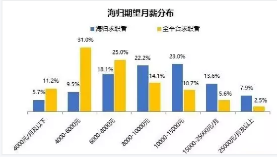 《2020中國海歸就業創業調查報告》顯示,近9成留學生回國后選擇就業,薪酬福利成為最看重因素。海歸求職者的期望薪資主要集中在8000—10000元/月與10000—15000元/月,而全平臺求職者,薪資更多集中在4000—6000元/月,這也成了許多企業不選擇海歸人才的原因之一。